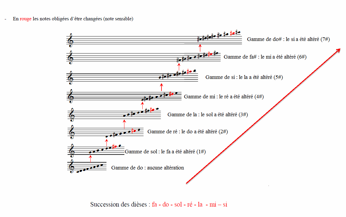 Chaque nouvelle gamme contiendra un son nouveau qui sera la 7° de la gamme élevé d’un demi-ton chromatique pour prendre le rang de note sensible